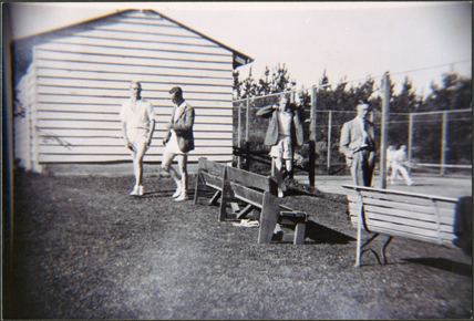 Somers. Tennis court at Campsie with Stan Carr, Jack T., Terry Hope-Campbell, Peter Luxton.