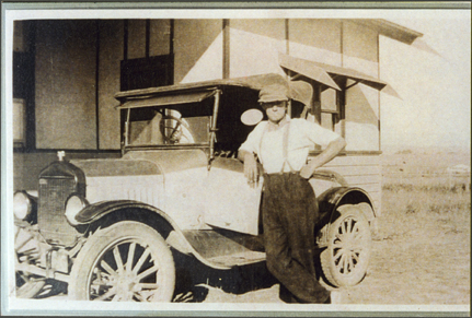 Merricks. Jack Joyner with the first car outside Maggie Vansuylen’s house. She was renting a white building next door.