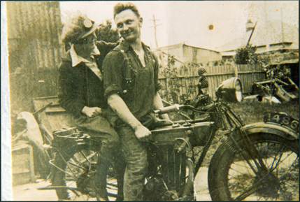 HISTORYMerricks. Eva Joyner with friend on motorcycle.