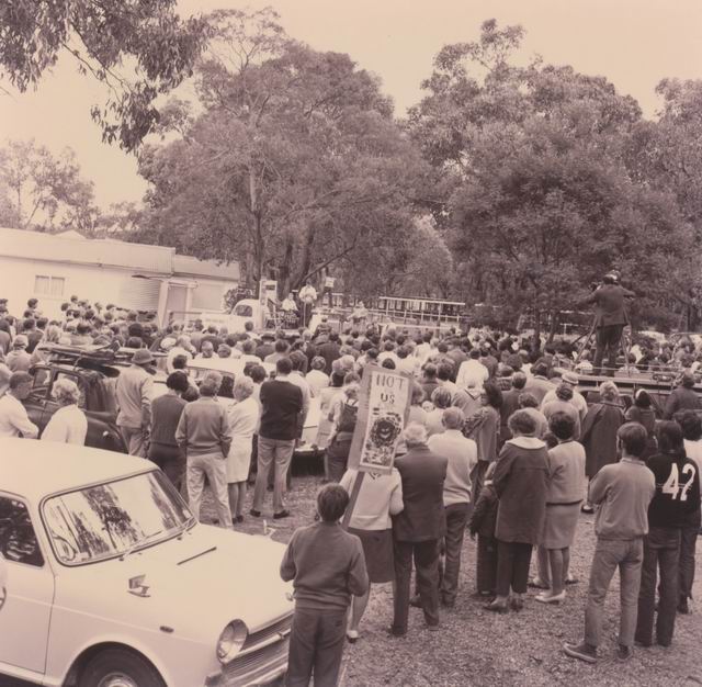 December 1970 protest meeting a t Balnarring Racecourse objecting to a proposed oil refinery (proposed by Sleigh and Ampol) At the mike is Cr Stan Smith and also Mrs Anne Cairns and Mr Alan Hunt. Although many did not oppose another refinery in Westernport, most opposed to the site chosen on 800 acres in Bittern. There should be no industry south of Myers Road or west of Hendersons Road. Those present eleccted a steering committee for the formation of a Peninsula wide Council to look into the Government’s industrial, economis and planning policy for the Westernport region of the Mornington Peninsula. Elected to this were Cr Stan smith, Cr Lorna Bennetts, Mr Gordon Bryant MHR, Mrs Anne Cairns assistant secretary of the Peninsula Conservation League, Dr W Carrol, Dr Lena Thomas, Mrs Ilsa van Rennan, Messrs W wiseman, Ronald Robb, John Hodgson, Angus McIvor. (Westernport News, November & December 1970). From Lorna Bennetts Newspaper Cuttings Collection.