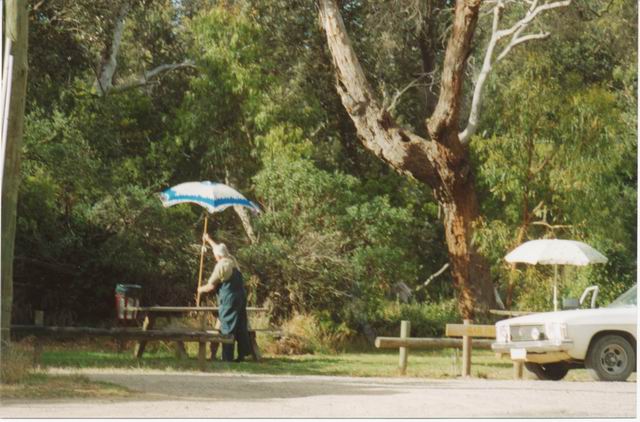HISTORYBalnarring Beach Foreshore Ranger Nick Bayne, 2003. Nick is setting beach umbrellas over picnic tables in Library Road.