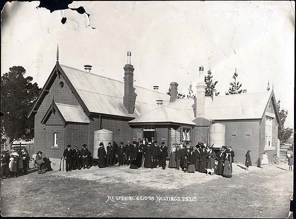 DESCRIPTIONThe image depicts the Hastings State School no. 1098 in 1913. The whole brick building is shown, with a timber entrance and a corrugated iron roof. There are about 30 adults and about 7 children grouped in front. There are 2 corrugated iron water tanks attached to the front of the building and what appears to be another at the back. At the bottom of the image is written in white “Re-opening S.S. 1098 Hastings, S:6.7.13”