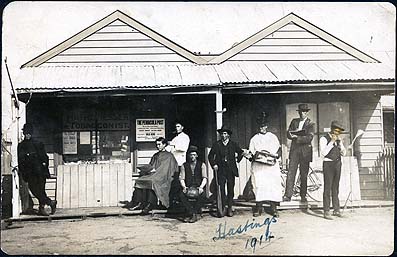 DESCRIPTIONThe image shows a double fronted single storied timber building with a corrugated iron roofed verandah. Above a window in the building is a sign on which the words “Hairdresser Tobacconist” can be made out. There is another sign which reads “The Peninsula Post ... sold here”. Leaning against the verandah is a bicycle. In front of the building are, from left to right, a man leaning against a verandah post, a man seated with another man standing behind him cutting his hair, a man seated with a football, a man standing holding a cricket bat, a man standing in a white coat holding a doctor’s bag, a man standing holding an open book, and a man standing playing a mouth organ, with a music stand in front of him. Written in ink at the bottom of the image is “Hastings 1914”
