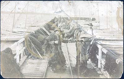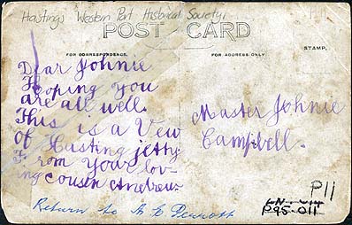 HISTORYOn the back of the postcard is written in purple ink “Dear Johnie Hoping you are all well. This is a Vew [sic] of Hasting jetty. From your loving cousin Andrew” Addressee is “Master Johnie Campbell”. Andrew Campbell was a storekeeper in the at Hastings. The bearded man in the photograph halfway down the jetty facing left is Alex Reid senior.