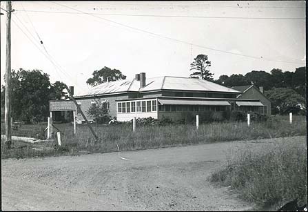 DESCRIPTIONThis image shows the Hastings & District Bush Nursing Hospital from the front, a single story brick building with a shaded verandah across the front facade and around part of the right hand side. A sign giving the name of the hospital is to the right of the building. A smaller building is on the left hand side and a gravel road is in the foreground, with a post and barbed wire fence in front of the building.
