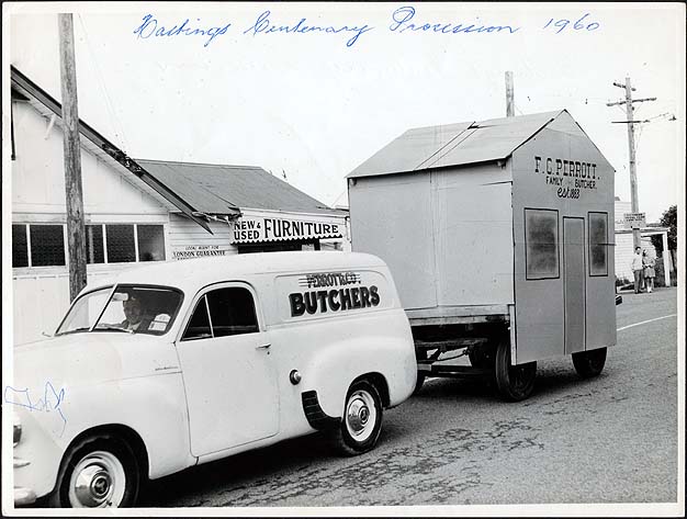 DESCRIPTIONThis image shows a white Holden panel van, presumably in the main street, with the words “Perrott & Co. Butchers” on the side of the van. There is one man, the driver, in the van. The van is towing a trailer carrying a small mock house with the words “F.G. Perrott family butcher est 1883” written on the side. Behind the van is a small timber shop with the words “New & used furniture” on the side of the verandah. Another small timber building can be partially seen behind the trailer, with a man and a woman standing in front.