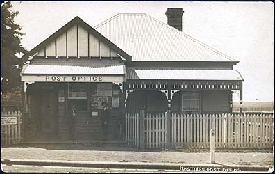 DESCRIPTIONThis image shows a double fronted timber house with a decorative bullnosed verandah and a galvanised iron roof. The right section has a picket fence and gate in front. The left section has the words “Post Office” above the verandah with several posters fixed to the wall. Two men are standing on the verandah with a bicycle.