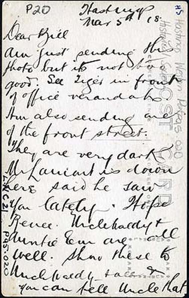 HISTORYOn the reverse side of the postcard are the words “Hastings Mar 5th 18 Dear Bill, am just sending this photo but its not too good. See Tiger in front of office verandah. Am also sending one of the front street. They are really dark. Mr. is down here, said he saw you lately. Hope Renee Uncle Waldy & Auntie Em are all well. Show these to Uncle Waldy & all that you can tell. Uncle Mat”. This house was built by Mr Dan Hoban, who lived with his mother and sisters at the Hastings Hotel which they owned from 1904 to 1918