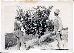 DESCRIPTIONThe image depicts two men dressed in old work clothes and hats, each holding a long spray and in the process of spraying a fruit tree.