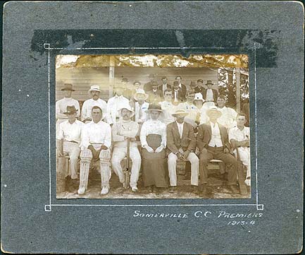 HISTORYThe Somerville Cricket Club team plus other interested persons at their Premiership win for 1913-14. The fourth player in the back row is either Arthur Thornell or Charlie Thornell. The fifth player is Percy Thornell. Members of the public are at the rear.