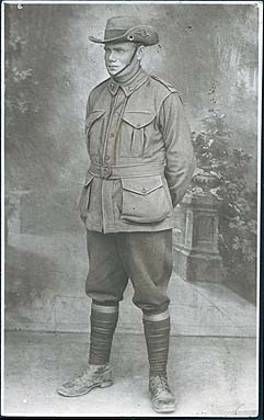 DESCRIPTIONThis image is of a World War 1 soldier in full army uniform posing for a studio photo. His hands are held behind his back, his legs are parted.