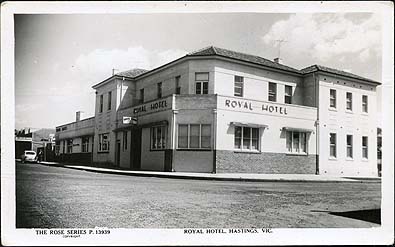 HISTORYThe Royal Hotel is on the corner of High Street and Salmon Street, Hastings. It was later re-named “Western Port Hotel”. The car in the street is a ‘Standard 10’. The printing on the front of the photograph is as follows: “The Rose Series P.13939” and “Royal Hotel, Hastings, Vic.”This is one of the series of “Rose” postcards of Hastings”. “A Real Photograph Produced in Australia” is printed on the back.