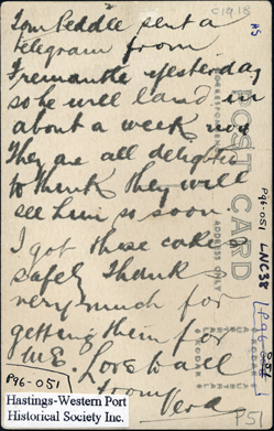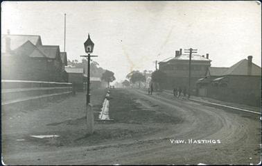 HISTORYThis is an early view of the main street in Hastings, now High Street. The Hastings Hall is on the left-hand side of the photograph and the Royal Hotel, later named Western Port Hotel, is seen on the right. “Postcard, correspondence, address only, Kodak Australia” are printed on the back of the postcard. A letter written in black pen on the back of the postcard is as follows: “Tom Peddle sent a telegram yesterday so he will land in about a week now. They are all delighted to think they will see him so soon. I got those cakes safely. thanks very much for getting them for me. Love to all. From Vera”.