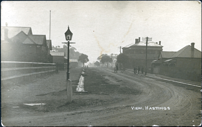 DESCRIPTIONThe image shows the very dark main street in Hastings. The road appears to be gravel and in the foreground is a beautiful street lantern. There are buildings on the left and the fight of the street. A three rail fence is on the left of the photograph. Trees are on the sides of the street further down. The gutters appear to be concrete. Printed on the front of the photograph in white is “View, Hastings”.