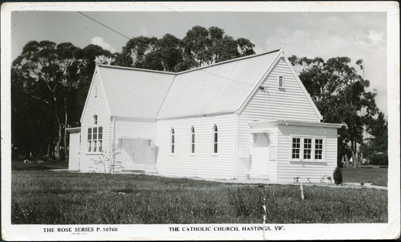 DESCRIPTIONThis is an image of the Catholic Church in Hastings. The church is a weatherboard building in pristine condition with lawn all around. Large trees are in the background. Printing on the bottom of the postcard is as follows: “The Rose Series P.10760 The Catholic Church, Hastings. Vic”.