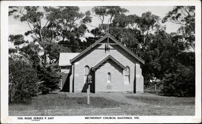 DESCRIPTIONThis image is of the Methodist Church in Hastings. It shows a brick building with a notice board on the right-hand side of the front section of the Church. There is grass all around with large shrubs on either side and large trees behind the church. Part of a fence can be seen in the background. Printed at the bottom of the postcard is: “The Rose Series P. 2407 Methodist Church, Hastings. Vic.”.