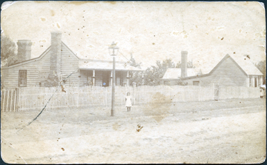 DESCRIPTIONThis image is of two weatherboard cottages with a picket fence at the front, facing a gravel street. A small gate is seen in the fence to the right of the photo. Both houses have large brick chimneys. A small girl is standing on the footpath facing the camera. An old gas street light is beside the road.