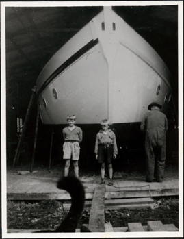 DESCRIPTIONThis image is of a large boat standing on wooden decking in a shed. It shows the front of the boat with two boys standing facing the camera and a man with his back to the camera working on the boat.