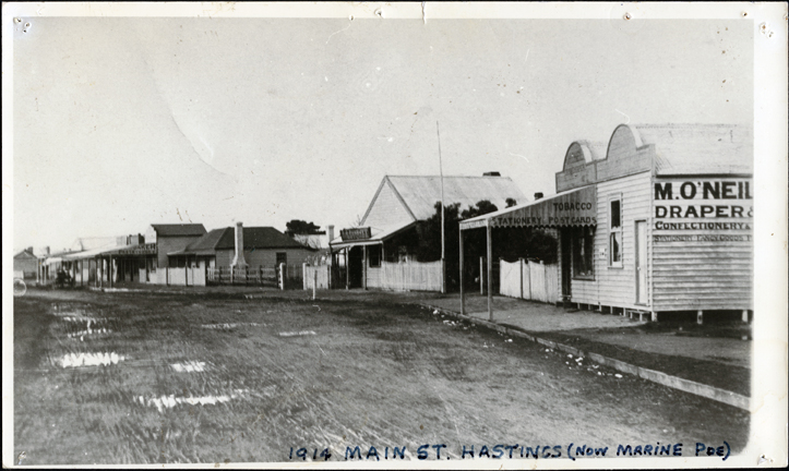 DESCRIPTIONThis image is of a street lined with shops. Some of the shops have verandahs with posts over the footpath. Writing can be seen on some of the shops. There are several fences both in front of and between the buildings. The street is earth with puddles of water in various places. The inscription on the front of the image reads: “1914 Main St. Hastings (now Marine Pde)”.