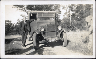 DESCRIPTIONThis image is of a man posing beside a Chevrolet truck which is parked on a dirt road. He is wearing a suit with a cardigan underneath his coat. His arm is resting on the truck door. A boy can be seen sitting on the top of a fence post at the far right of the photograph. Trees can be seen in the background. The number plate of the truck is 62-363 and the word ‘CARRIER’ can be seen above the windscreen.