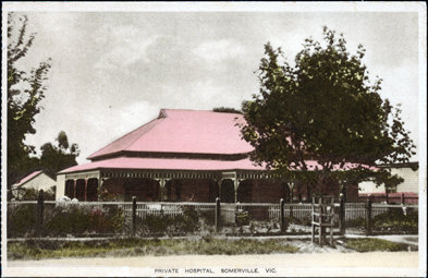 DESCRIPTIONThis image shows a lovely old home with a red roof and verandah all around. There is a small building at the rear on the left-hand side of the home. There is a front fence and part of a side fence can be seen between another building. A concrete footpath, grass and the street is in the foreground. A tree is on the footpath surrounded by a boxed support frame. There are large trees to the left and rear of the image. A flower garden has been planted across the front, just outside of the front fence Printed at the bottom of the postcard is: “Private Hospital, Somerville. Vic.”.