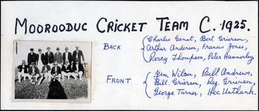 HISTORYThis is a photograph of the Moorooduc Cricket Team in 1925. The names of the men are: