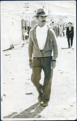 DESCRIPTIONThis is an image of a man walking along outside a marquee. He is looking away from the camera and is mid-stride. He is wearing a white shirt, done up to the collar, cardigan and dark trousers and a hat with a very wide band. He has a large moustache and is wearing spectacles. There are many people in the background, including two men wearing suits, ties and hats who are walking a short distance behind him.