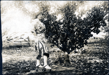 DESCRIPTIONThis image shows a man in fancy dress, standing next to an apple tree. He is wearing a floral dress with a large slit on the side, a wig, earrings and roller skates. There are leaves all over the ground and a wooden frame is on the left-hand side of the photograph. The top and left-hand side of the image has been over exposed to light.
