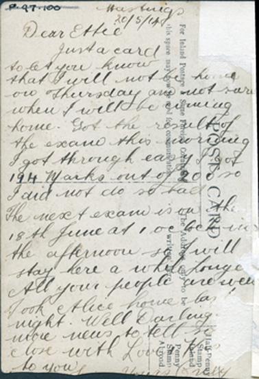 HISTORYThis is a photograph of Reuben Perrott, in fancy dress, taken in 1913. It was sent, as a post card to his sister Ethel (Effie) on 20/05/1914. Reuben is the son of Frederick George Perrott, an early butcher in Hastings. Reuben’s other sister, Alice, is referred to in the letter on the back of the post card which reads as follows: “Hastings 20/5/14 Dear Effie Just a card to let you know that I will not be sure when I will be coming home. Got the result of the exam this morning. I got through easy. I got 194 marks out of 200 so I did not do so bad. The next exam is on the 18th June at 1 o’clock in the afternoon so I will stay here a while longer. All your people are well. Took Alice home last night. Well Darling no more news to tell so will close with Love & Kisses to you. Yours truly”. Also printed on the back is: POST CARD For Inland Postage & Some Foreign Countries this space may now be used for communication The Address only to be written here Half Penny stamp Inland Penny Stamp Abroad”.