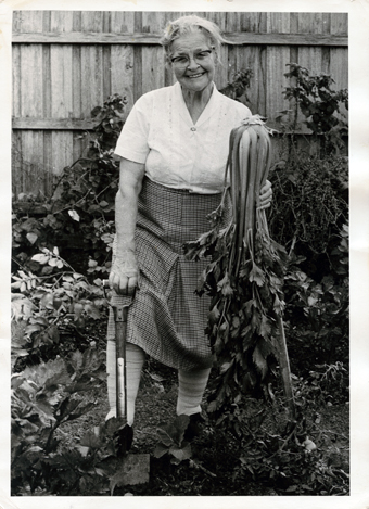 DESCRIPTIONThis image shows an elderly woman standing in a vegetable garden. She has just dug up a large plant which she has in her left hand. She has a spade in her right hand. He is wearing a white embroided, short sleeved blouse with a small brooch at the top where the collar meets. She is wearing a plaid skirt with an inverted pleat in the centre. Her legs are wrapped in bandages. She is wearing spectacles and has a happy smile on her face. Her grey hair is untidy. There is a high wooden fence behind her.