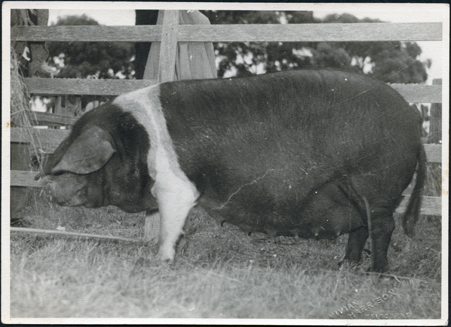 HISTORYThis pig belongs to T.H. Barclay, a mixed farmer from Graydens Road, Tyabb. Written on the back of the photograph in blue biro is: “Dunny Braes Nell 1st A Champ Mirboo North 1954 1st A Champ Leongatha 1954”.