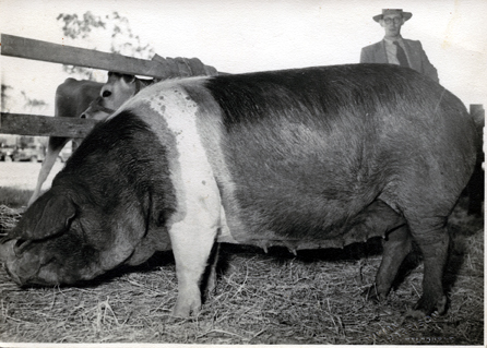 HISTORYThis pig belongs to T.H. Barclay, a mixed farmer from Graydens Road, Tyabb. Written on the back of the photograph in blue biro is: “Jona Vale Beauty 2nd, 3rd Melb 1953 1st Champ Lang Langt 1954 1st champ Korumburra”.