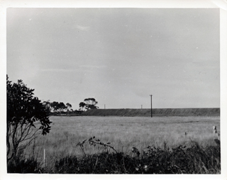 DESCRIPTIONThis image shows a grassed block of land. In the background there is a large earth wall which appears to be the wall of a dam. Four power poles can be seen. There are some large trees in the background on the left-hand side of the image. In the foreground, on the left-hand side of the image is a tree with a small post beside it which has the top half painted white. A vine is growing across the front of the image. A small stump of a tree is on the far right-hand side of the image.