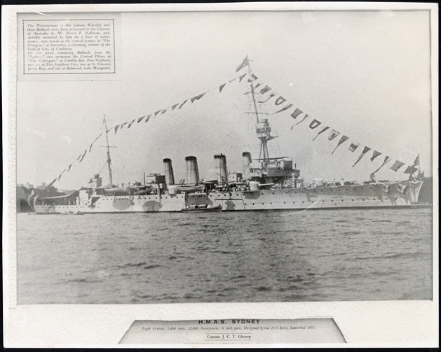 This image shows the H.M.A.S Sydney in port. The ship has four large funnels and a line of flags flowing from end to end supported by two tall masts. There is a large expanse of water in the foreground. There is a small boat along side the ship. Printed on the mounting beneath the image is information about the ship and the action on 9th November, 1914.. There is also information in small print in a text box in the top left-hand corner of the photograph.