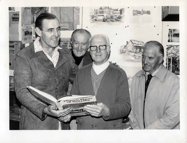 DESCRIPTIONThis image shows four men posing for a photograph. There is a tall man on the left-hand side of the photograph, smiling and holding a book, “Historic Places of Australia”. He is wearing a patterned shirt with the collar over the top of his buttoned-up jacket. He has his hand on the shoulder of a man in the centre of the image, who is also holding the book. This man is wearing a T-shirt, pullover and cardigan and wearing spectacles. There is a man standing behind and between them smiling broadly at the camera. Another man on the right-hand side of the photograph is looking on and smiling. He is wearing a shirt, tie and a jacket zipped at the front. The wall behind the group is covered in pictures, paintings and newspapers articles.