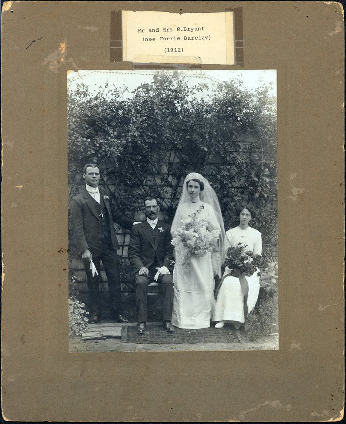 HISTORYThis is a wedding photograph of Owen Bryant and Coral (Corrie) Barclay. Typed on a piece of paper and taped to the front of the mount is “Mr and Mrs O. Bryant (nee Corrie Barclay) (1912)”. Written on the back in black pen is: “Owen & Corals group December 4th 1912” also written is: “T.B.”.
