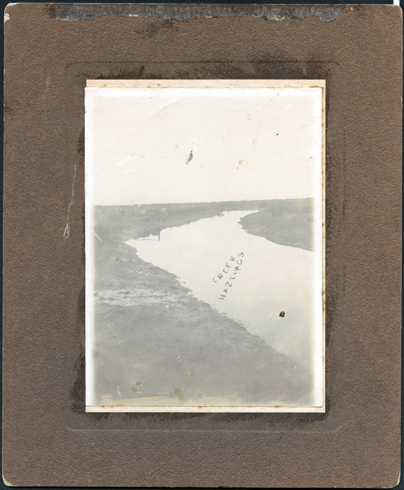 DESCRIPTIONThis image shows a creek with a shore line on either side. There is some scrub on the banks of the creek and trees on the distant horizon. The image is very faded. Printed in the middle of the image is: “Creek Hastings”. The letter ‘s’ in Hastings has been printed back-to-front.