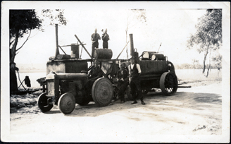 DESCRIPTIONThis image shows road-making equipment parked on the side of a gravel road. A tractor is in the foreground, probably a Fordson. A large trailer with drums, probably containing tar, is behind. The trailer has large steel wheels. Bitumen heating equipment is at the rear. Two men are standing on equipment at the rear and in the foreground, one man is standing on the road and another sitting beside him on the trailer. There is part of a tree on the left-hand side of the image and an item of clothing is hanging on a stick. There are trees on the right-hand side of the image.