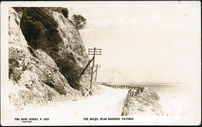 DESCRIPTIONThis image is of a road winding around a cliff with Port Phillip Bay on the right-hand side. There is a post and rail fence on the Bay side of the road and electricity posts on the left-hand side of the road. Some bushes can be seen growing out of the rock on the side of the cliff. Printed at the bottom of the image is “The Rose Series, P. 1022 Copyright” and “The Rocks, near Rosebud, Victoria”.