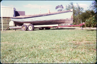 DESCRIPTIONThis image shows a wooden fishing boat on on a four-wheeled trailer, parked on grass. Part of a shed can be seen on the left-hand side of the photograph and trees and shrubs on the right-hand side of the photograph.