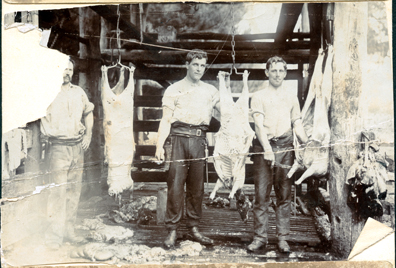 DESCRIPTIONThis image shows a shed made of rough timber with three men standing facing the camera with an animal carcass hanging from hooks between each man. The man on the left-hand side of the photograph is standing with hand on hip and part of his face and shoulder has been torn away. All men have shirt sleeves rolled up and are wearing wide leather belts with ‘knife holsters’ attached. The man on the right-hand side has a cigarette in his mouth. Trees can be seen in the background.