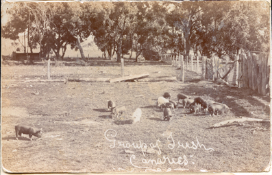 DESCRIPTIONThis image is of a group of about 15 pigs feeding in a fenced-in paddock. There is a post and wire netting fence at the rear and a rough timber and wire fence on the right-hand side of the photograph. Another fence can be seen in the background and a building is on the left-hand side in the distance. Trees line the far back fence and the side fence. There are logs lying along the middle fence. Written at the bottom of the photograph is: “Group of Irish Canaries”.