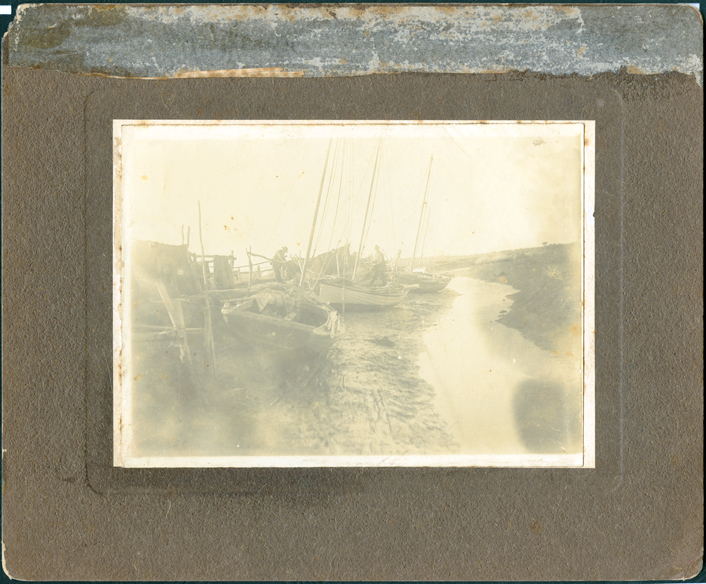 DESCRIPTIONThis image shows several small fishing boats on a mud bank beside a small creek. Three of the boats have tall masts. A man can be seen working on the middle boat and another man is nearby, slightly bent over, working on fishing gear that is hanging over a rail. There are fences and posts on the left-hand side of the photograph with fishing nets etc hanging over them. The two men are dressed in suits and are both wearing hats. Small shrubs can be seen on the bank on the right-hand side of the creek.