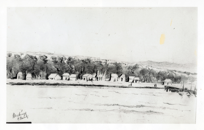 HISTORYThis is an early sketch of Hastings and the foreshore. The original sketch is in the Picture Collection at the State Library of Victoria and is from the K. Kennedy Sketch Book.