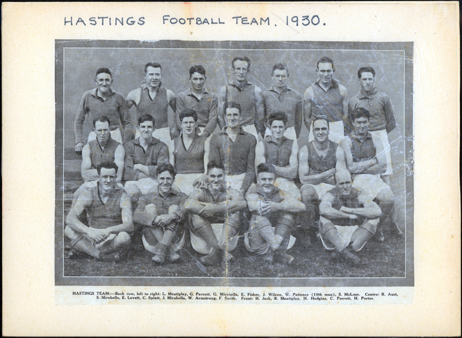 DESCRIPTIONThis image shows a football team posing for a photograph. There are seven men standing in the back row, seven men sitting in the middle row and five men sitting on the ground in the front row. All are wearing long socks, white shorts and shirts with either long sleeves or sleeveless. Printed at the top on the mounting is: “Hastings Football Team. 1930 and printed on the mounting at the bottom is: Hastings Team:-Back row, left to right: L. Mentiplay, G. Perrott, G. Mirabella, E. Fisher, J. Wilson, W. Patience (19th man), S. McLear. Centre: R. Aust, S. Mirabella, E. Lovett, C. Splatt, J. Mirabella, W. Armstrong, F. Smith. Front: H. Jack, R. Mentiplay, H. Hodgins, C. Perrott, H. Porter.”