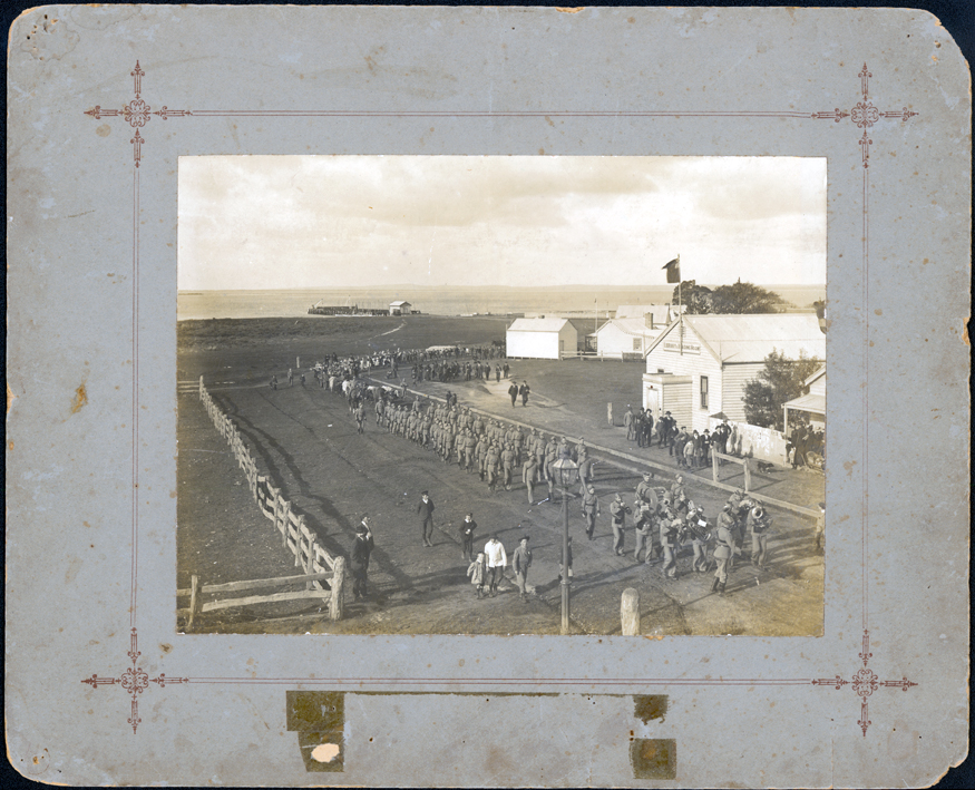 DESCRIPTIONThis image is of a military detachment marching in the street led by a military band. A soldier on horseback is behind them and a team of bullocks, pulling a cannon on a gun carriage is following. Men, women and children are bringing up the rear. Wooden buildings with iron roofs, including the Library & Reading Room, are on the right-hand side of the image. A bay with jetty and fishing shed can be seen in the distance. People are walking along either side of the parade. A post and rail fence is seen on the left-hand side and a hitching post is on the right-hand side of the image. A gas lamp is in the foreground. The photograph is taken from an elevated height.