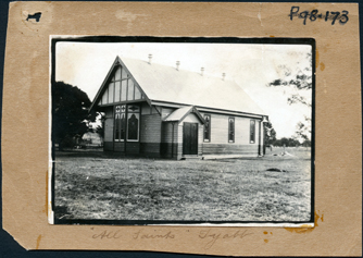 DESCRIPTIONThis image shows a church with a large section of grass in the foreground. A large tree is to the right of the church and other trees can be seen in the background. The building is timber with an iron roof. There is a band of darker boards around the bottom of the building. Three windows can be seen on the right-hand side of the narthex and three windows can be seen at the front of the building. Thin strips of timber decorate the triangular roof line above the windows. Four air vents are along the top of the roof. Part of a post and wire fence can be seen behind the church on the right-hand side. Written on the bottom of the mounting is: “All Saints Tyabb”. The mounting is brown paper.