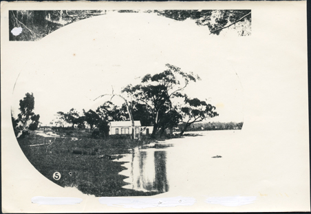 DESCRIPTIONThis is a circular image showing a house set back with large trees behind it on the water’s edge. Land can be seen in the far background with roof tops amongst the trees. The number 5 is printed on the bottom left-hand side of the image. Part of a photo showing branches seen at the top.