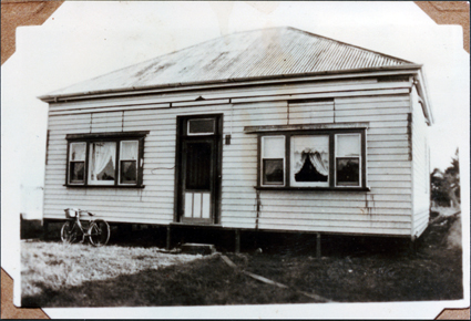 DESCRIPTIONThis image shows an old house taking up most the photograph. It is of timber construction and has an iron roof. A set of three windows are on either side of the front door. There are blinds and lace curtains at the windows. The house is on low stumps and a block of wood in used for a step at the front door. A ladies bicycle with a basket on the front, is leaning against the house. There is grass in the foreground and trees can be seen in the background on the far right-hand side of the photograph. Photograph ‘corners’ are seen on each corner of the photograph.