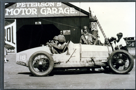 DESCRIPTIONThis image shows a racing car parked outside a large shed. Peterson’s Motor Garage is written in large white letters on the front of the building. A man is sitting at the wheel, another standing at the side of the car and a small boy is at the front of the car holding a large white jug. A man is standing at the entrance to the shed. There is a petrol bowser in front of the garage on the right-hand side of the photo and a ladder is leaning up against the shed nearby. Part of a petrol sign can be seen on the left-hand side of the photograph.